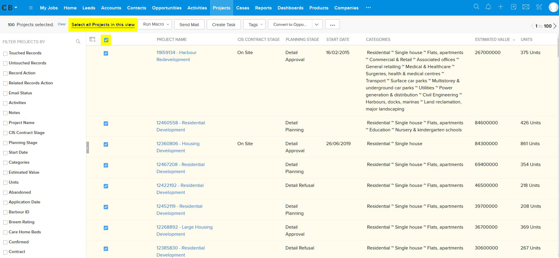 11) To mass convert the selected Projects into Opportunities in one go, use the dropdown button highlighted below. Then select ‘Convert to Opportunities’